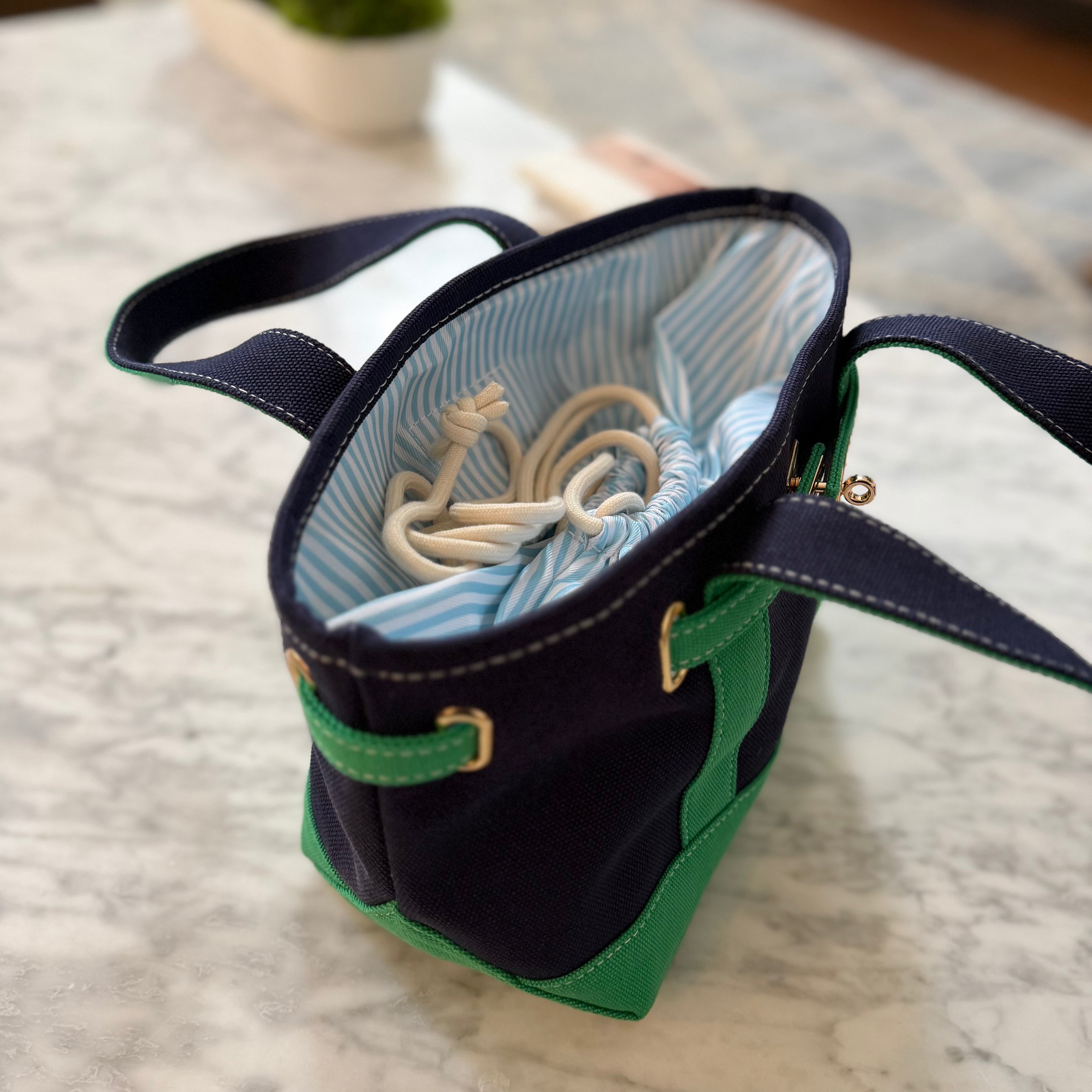 An optional drawstring enclosure offers added security when you want it—or tuck it away for a an open tote style. Compact but practical, the Charleston has room for your daily essentials while keeping its timeless mini-tote shape.
